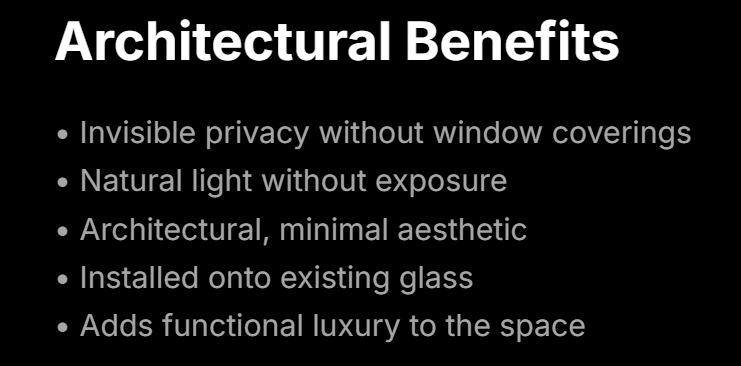 On-demand privacy, solar control, and modern glass solutions for residential and commercial spaces worldwide.